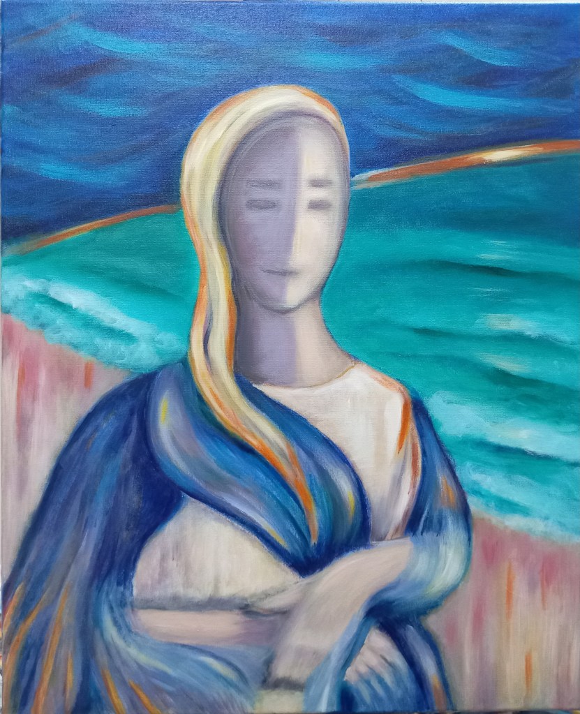 «Madonna de la luna azul», 2023, acrílico sobre lienzo, 61×50 cm, Maria Evseeva